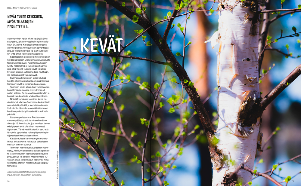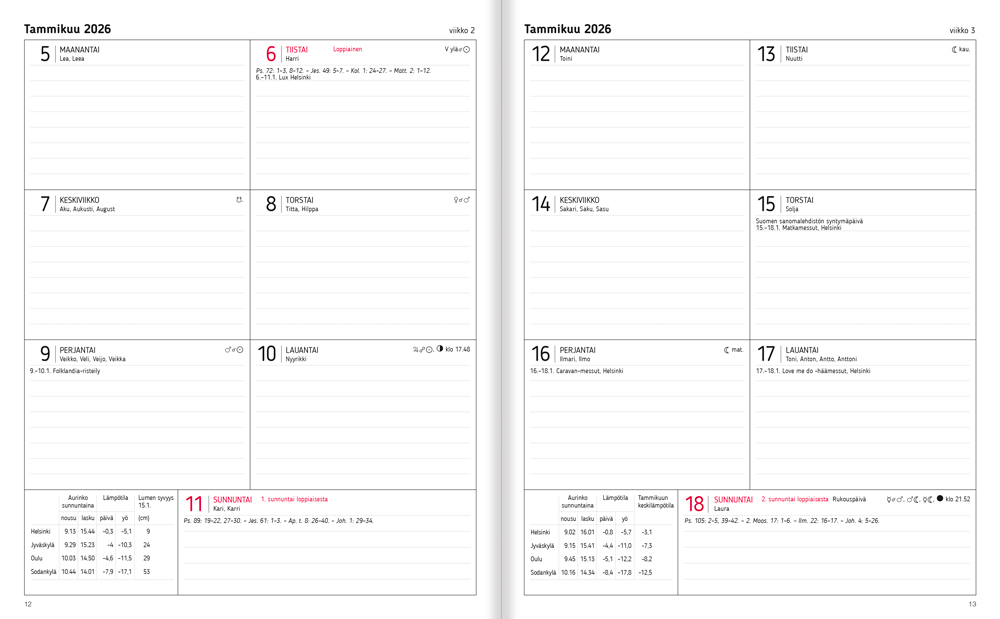 Kalenteri tarjoaa päivittäisten, kattavien perustietojen lisäksi runsaasti tilastotietoa ympäri Suomea. Kalenterisivuilta löytyvät keskilämpötilat, sadepäivien määrät ja kasvukauden pituudet. Sivuilta selviävät myös muun muassa auringon nousu- ja laskuajat sekä kuun eri vaiheet. Kalenterissa on myös yli 30 sivua lukemista, artikkelien aiheina ovat luonto, historia ja puutarha. Lisäksi kattaukseen on valikoitu rakastettuja reseptejä ja neuleohje villatakille sekä torkkupeitolle. Kalenterissa on reilusti tilaa omille muistiinpanoille!